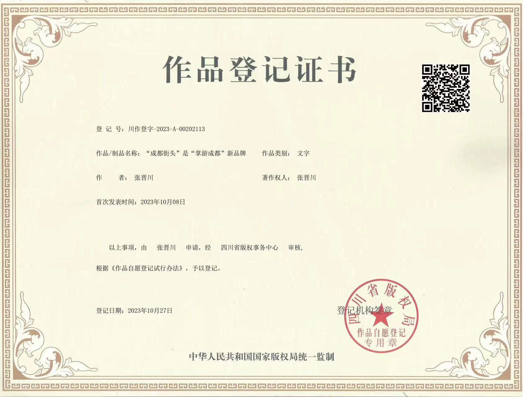 20231027作品登记证书-“成都街头”是“掌游成都”新品牌
