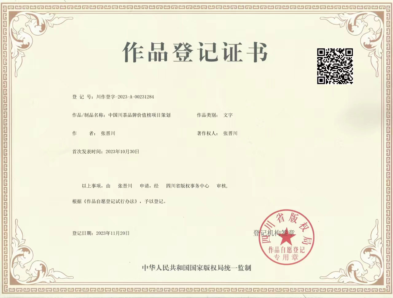 20231120作品登记证书-中国川茶品牌价值榜项目策划